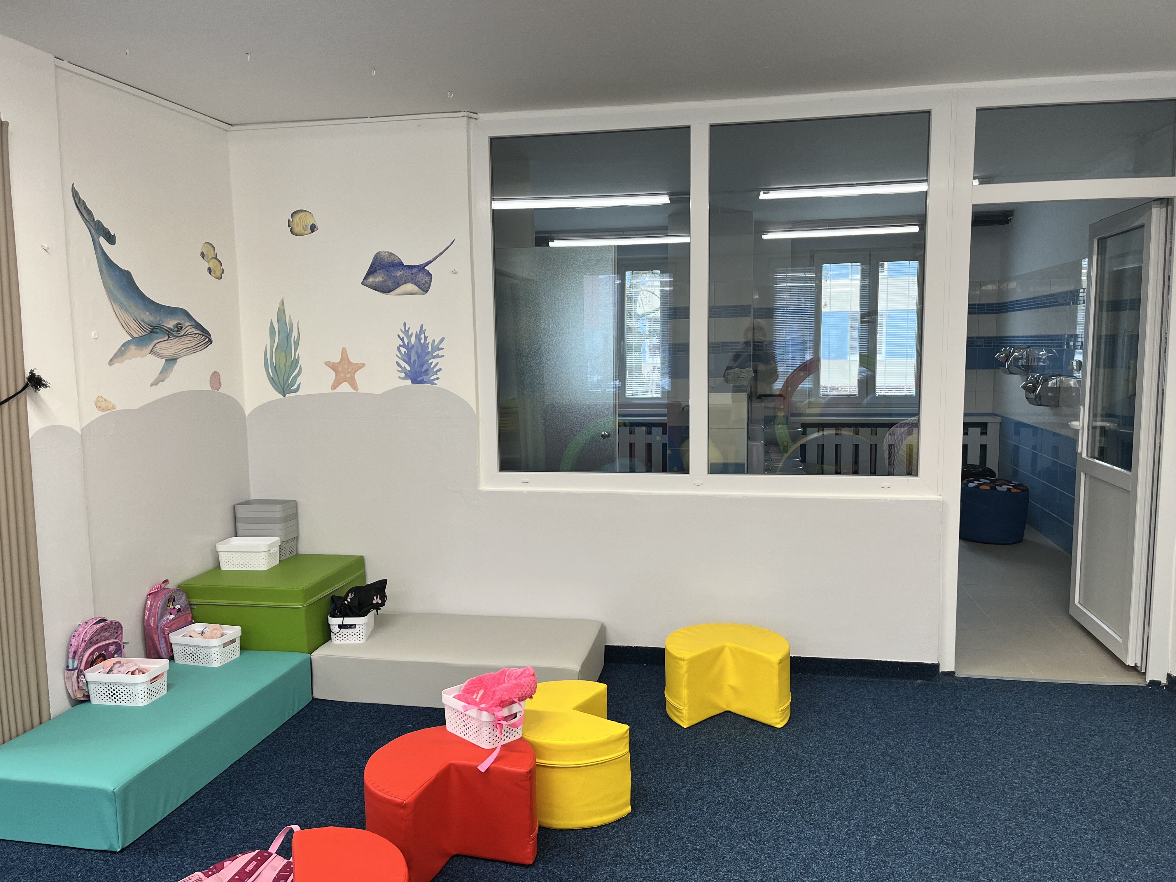 Děti, které nejsou právě v bazénu, využívají tělocvičnu. Mohou se zde věnovat pohybovým aktivitám, nebo se zapojit do her s konstruktivními stavebnicemi. Z tělocvičny je vstup do bazénu.