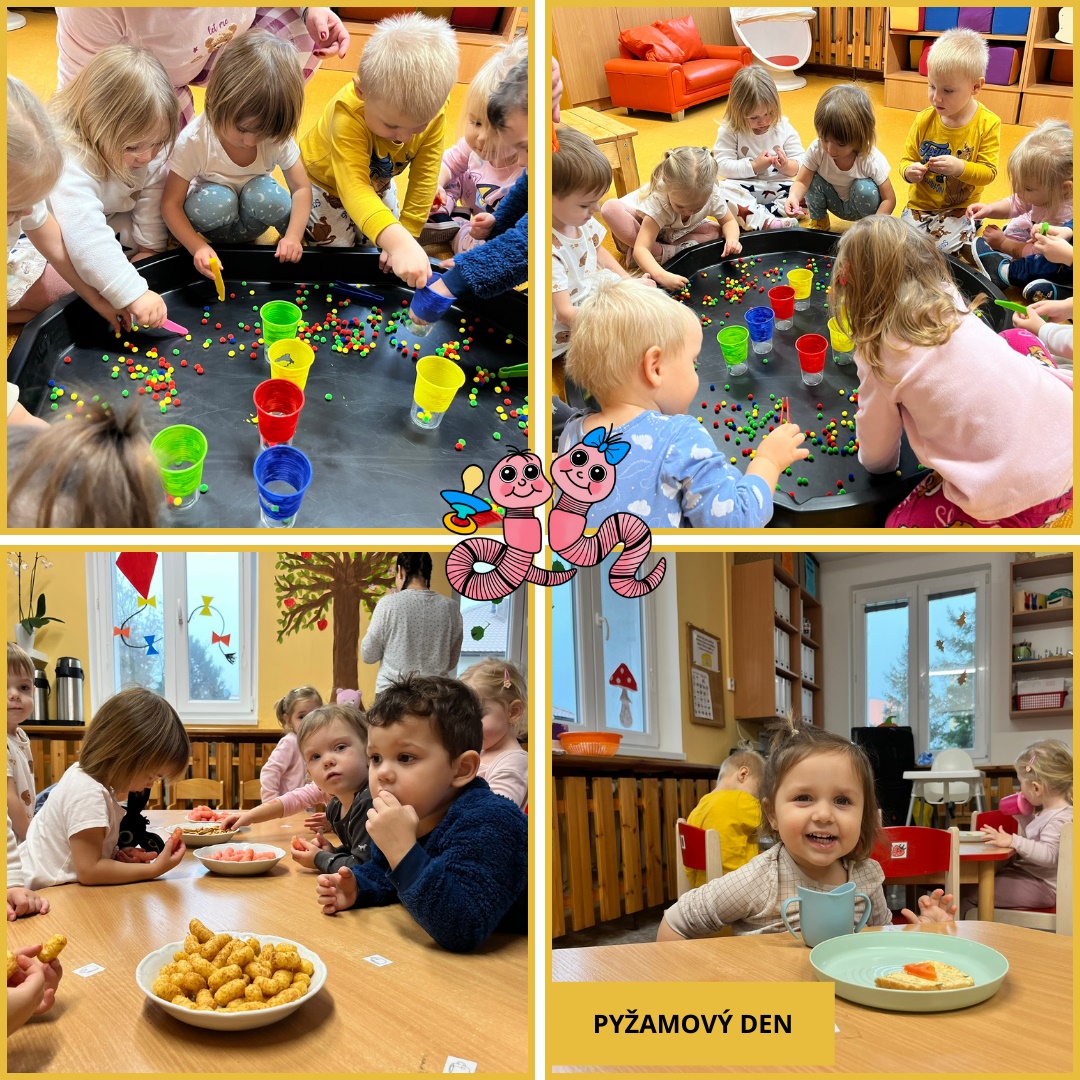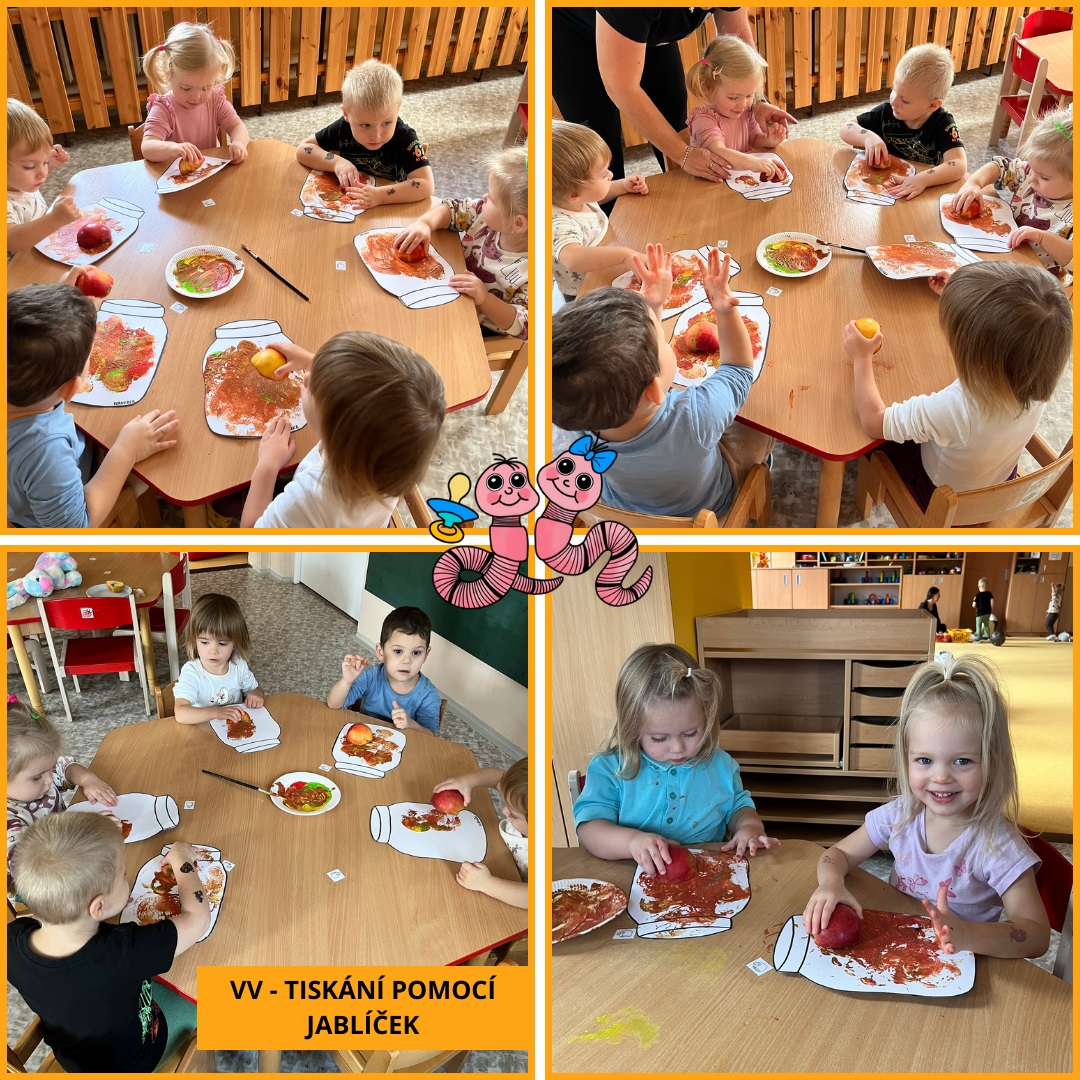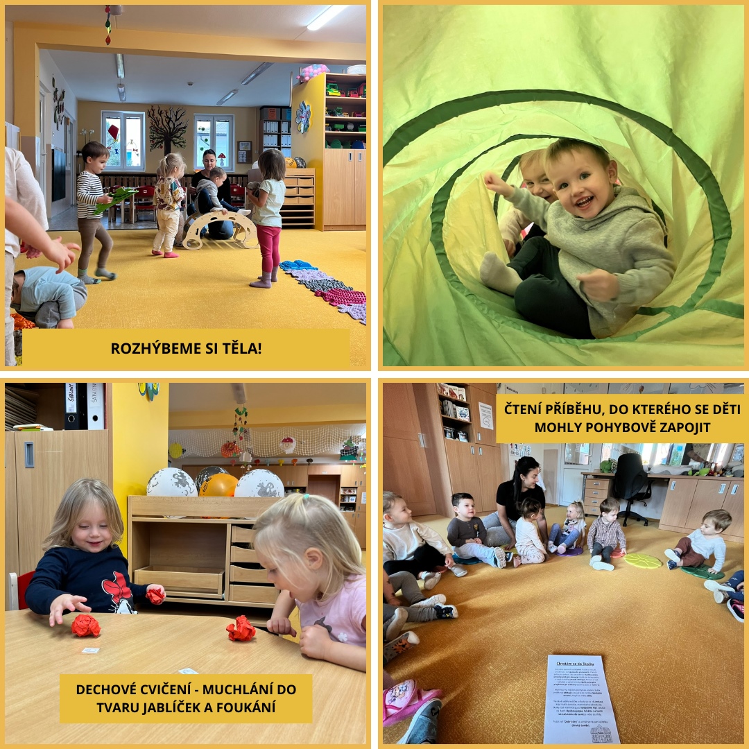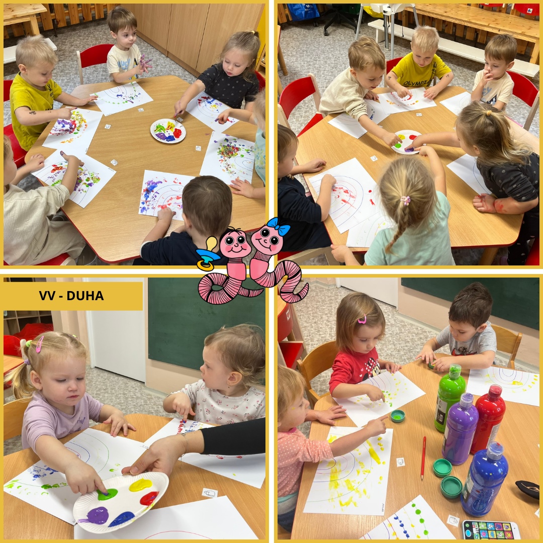 Během uplynulého měsíce jsme s dětmi prožili pestrý program plný tvoření, her i společného povídání. V rámci podzimního tématu „Podzim všemi smysly“ si děti vyzkoušely tiskání rozpůleným jablíčkem a pomocí prstů vytvářely barevnou duhu. Postupně jsme se také začali připravovat na natáčení videa k vánoční besídce a společně jsme si užili veselý pyžamový den.